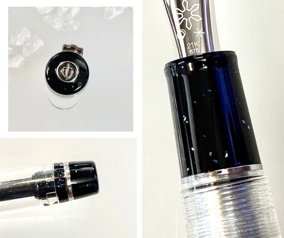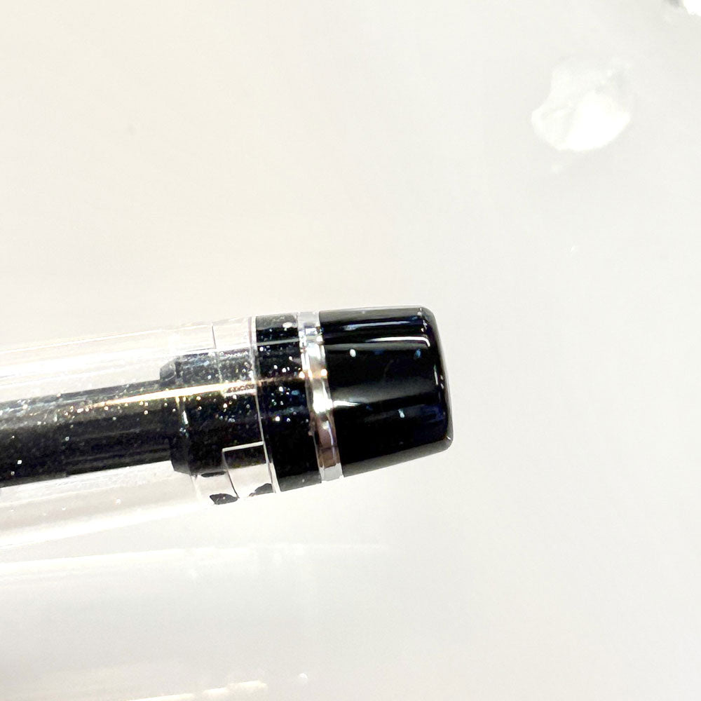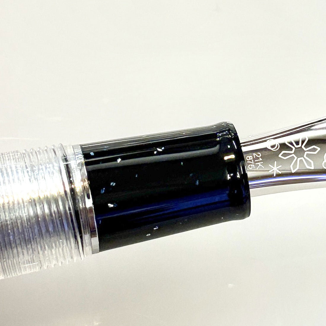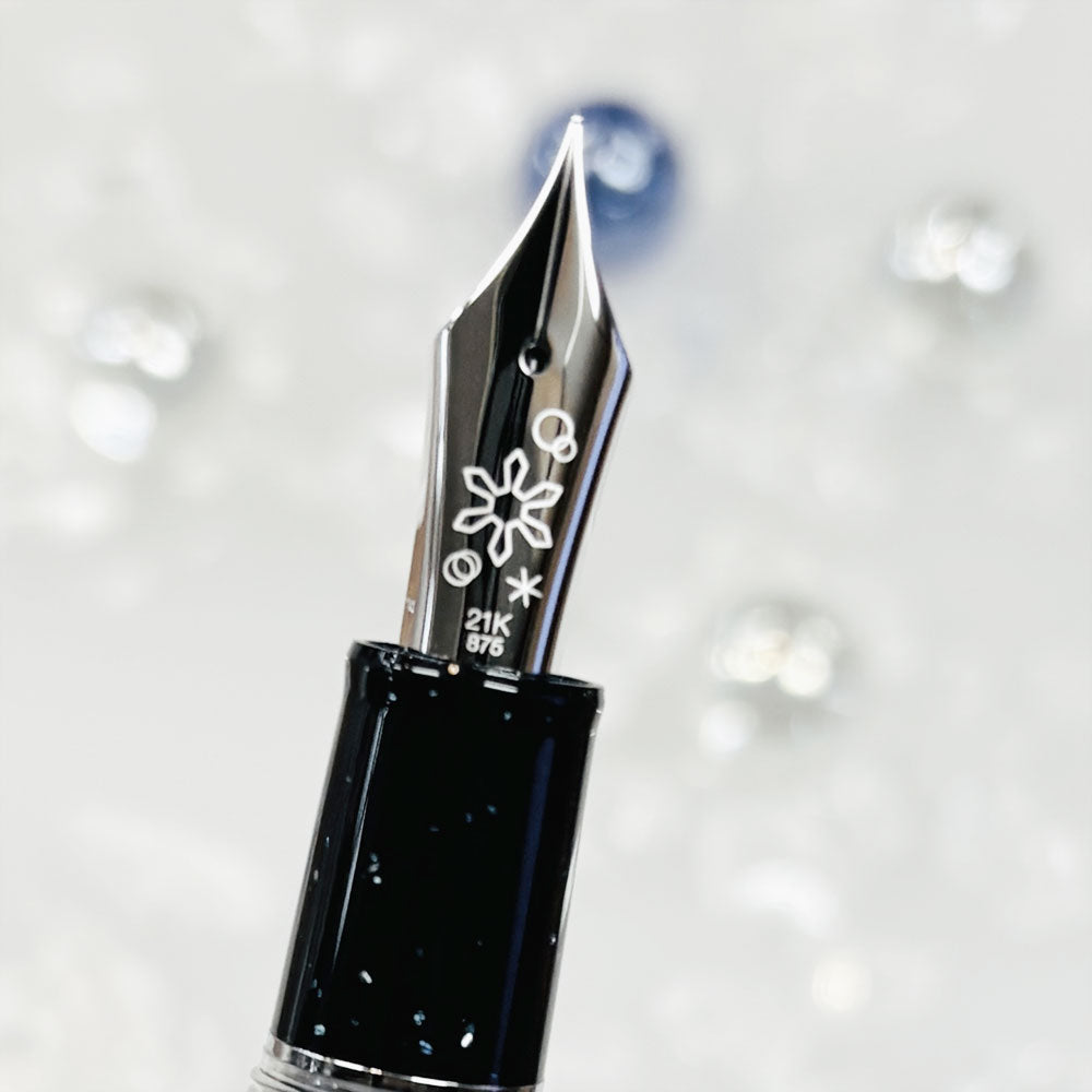 大粒のラメを、首軸・蓋栓・尾栓に使用しています。 ペン先には、「氷の上をすべるように書けるように」と願いを込めて、